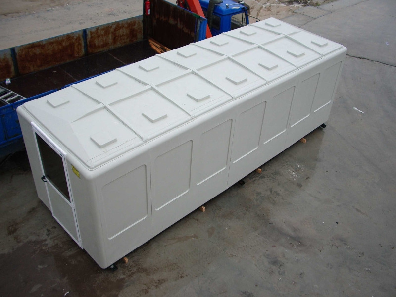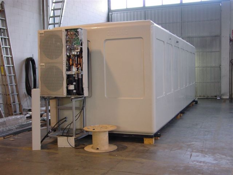 En la fabricación de estas casetas de fibra de vidrio observamos que la construcción standard de los paneles y techos que forman estas cabinas es un sándwich con placa de espuma de poliuretano como alma en espesor de 20 mm. en los paneles y 35 mm. En los techos, los paramentos internos están acabados a base de pintura plástica cubierta con esmalte acrílico color marfil.